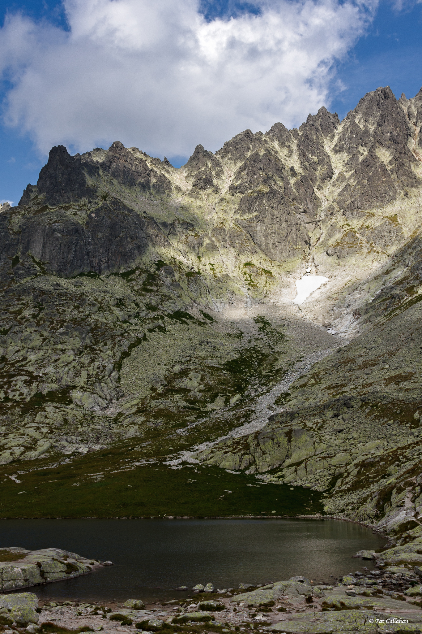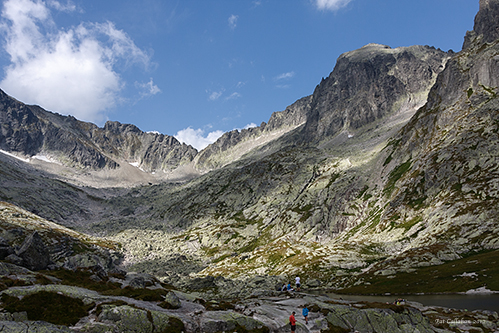 Tatranska Lomnica is the start point for several high alpine hikes so a convenient overnight for hikers. We planned to ride two gondolas above the village to start our hike. However, high winds closed the second gondola making the planned hike not feasible. Igor and Vlasta had a backup plan which involved hopping the electric train to Stary Smokovec and taking the funicular up to the trail head. By mid morning, we were underway. Hiking in the high Tatras, due to the relatively low altitude, is a warm pursuit during a sunny summer day. I planned for the nearly always cool days of the high altitude Rockies before realizing I was a bit overdressed to the temperatures. Both regions share beautiful mountain scenery; jagged mountain peaks,