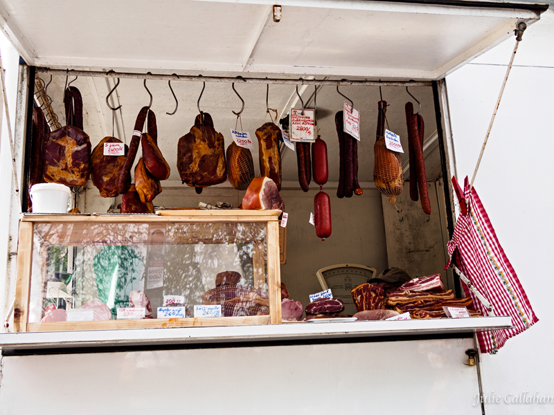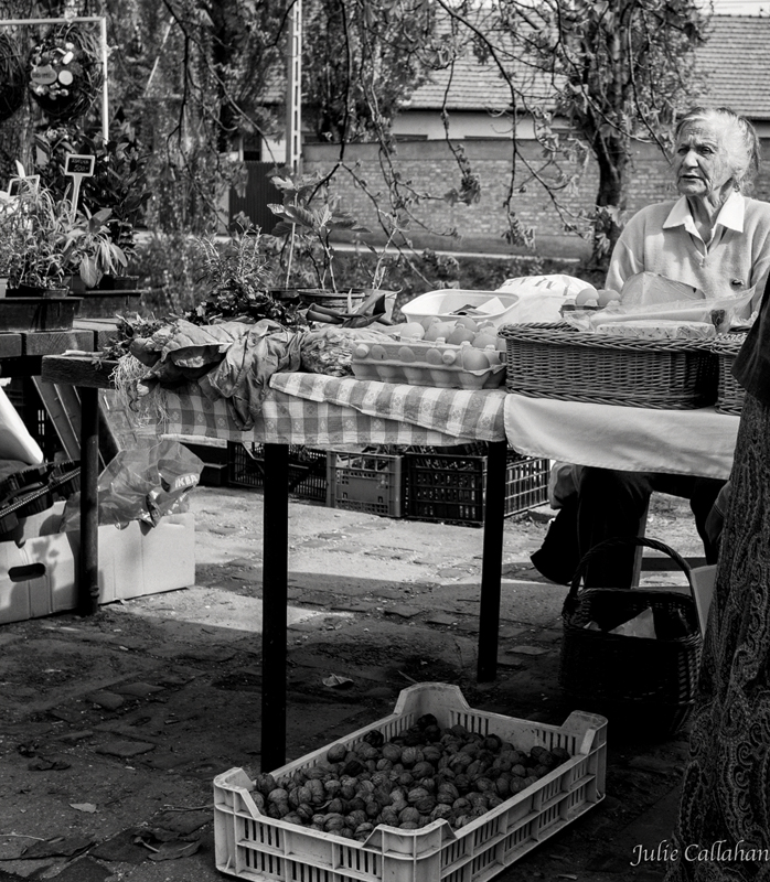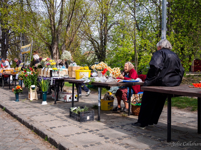 up along the banks of a stream which trickles towards the Danube. The vendors here have formed a consortium of sorts. A gray-haired woman brings eggs and potatoes; another carries pasta; a man, bear wrestling with his children, appears to be the fruit and vegetable vendor; some augment their booths with fresh-cut flowers. At the end of the market is a stand of Hungarian meats, predominately lard based affairs. Put together, the vendors create a meal. In front of me a young mother pulls one of the ubiquitous hand carts filled with produce as her young daughter lags behind cradling an arm load of flowers. Everywhere, I hear a Hungarian chorus as friends greet friends, clients greet vendors. Crossing the bridge to head back towards town, Roma women sell cutlery, their station in the market much the same as it is in life, a quiet presence relegated to the margins.