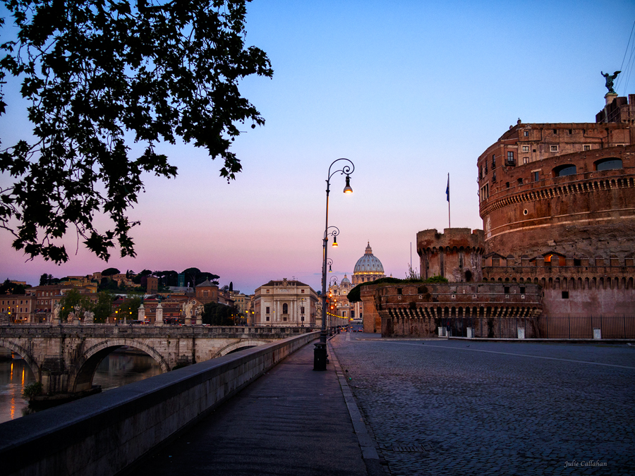 At daybreak, I threw on yesterday’s clothes and ran out to catch the early morning light. St. Peter’s appeared to float; a peach and yellow mirage in the “golden hour” of dawn. I climbed up on a bridge, stumbled and nearly dropped my camera in the river as I tried to balance and reach over my head for the perfect shot (Pat, I swear, I would have dove in after it). Once the light grew more intense, I sought out a cafe near our hotel. Waiters in crisp white shirts and black vests dish up freshly baked cornettas and perfectly foamed cappuccinos for a paltry two euro to the early commuters. Mouth watering, sublime.