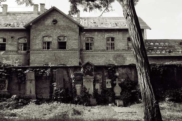 Beyond the Keleti train station, past the ornate Kerepesi cemetery – final resting place of the Hungarian elite – down a weed covered tram track line and in the shadows of the somewhat threatening Budapest Josefvaros train station is the Jewish cemetery. As we made our way to where the map indicated the entrance would be, we nearly turned back. This is the fringe of one of seedier neighborhoods. A lone drifter paced near the wall. Every single window was smashed in the station. Not another sole was in sight. Pat held his camera tighter, and we pushed on even after the sidewalk vanished into a path of weeds. Then we heard the howling of the guard dogs and came upon the gate.