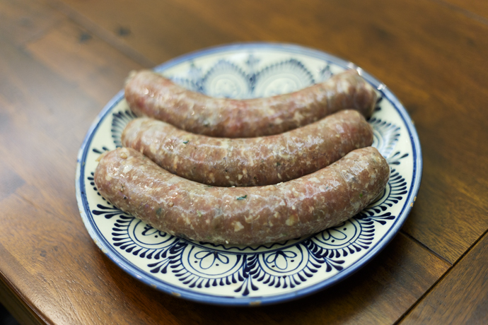 That night, I defrosted the bulk sausage, soaked the intestines in water for 30 minutes, tied a knot in one end and then scrunched the entire length up onto the nozzle. As I pushed the meat through the funnel, a sausage popped out on the opposite end. “Pat, grab the camera!” He ran in and photographed me giving birth to two pounds of Italian sausage.