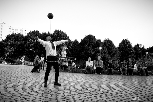 The people next to us jumped up and left just before the end of the show but we did not follow. I dug five euros in change from the bottom of my purse – an amount which seemed fair for three people. After the show, I asked if he ever juggled at Belleville Park. “That’s where I learned,” he smiled. “Now, I juggle for Cirque du Soleil. I’m leaving for Boston soon.” Before he goes, Pat is going to photograph a performance and provide photos for the juggler’s website.