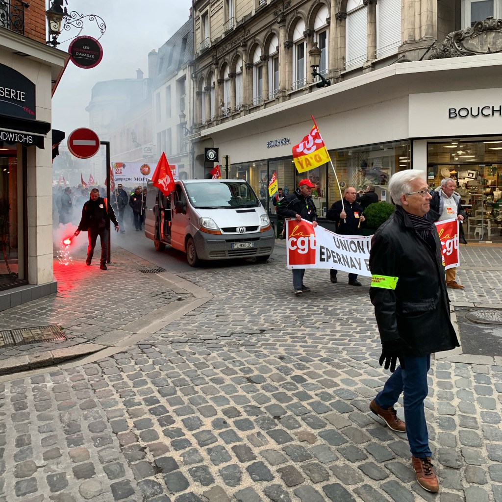 As I turned the corner, I was met by protestors, the champagne workers union of Épernay, who also, it turns out, planned to walk the avenue. It was a sonic BOOM and acrid smoke-filled parade. I turned down a side street and scampered away.