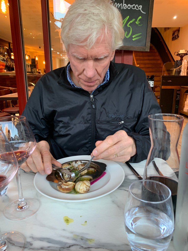 Dinner on the square: snails, smoked salmon, beef checks, burgundy.