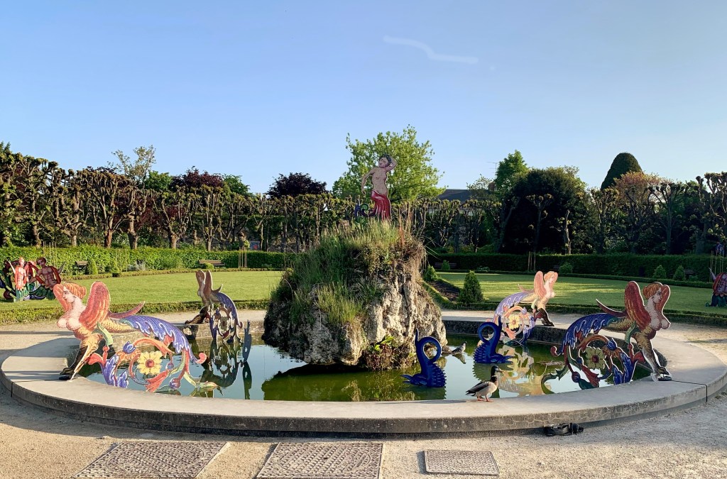 Its a simple enough garden—square, a mix of grass, flowers and pebbled walkways. And yet, as I approach the center, I notice the soft-porn fountain—frolicking creatures that are half buxom young maidens and half … what? Bird? Dragon? I laugh at its ridiculousness. (At this point, I was going to christen the garden Tulips. and Titties. But Pat says I shouldn’t. So I won’t.)