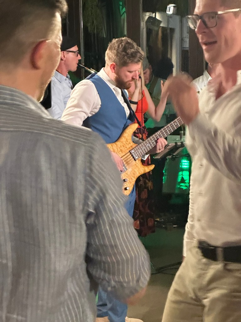 We ate pork loin and sauerkraut, and then the band started up. The first song was Earth Wind and Fire’s September, and Abe played the bass. The dance floor filled. From there, we jumped into Twist and Shout.
