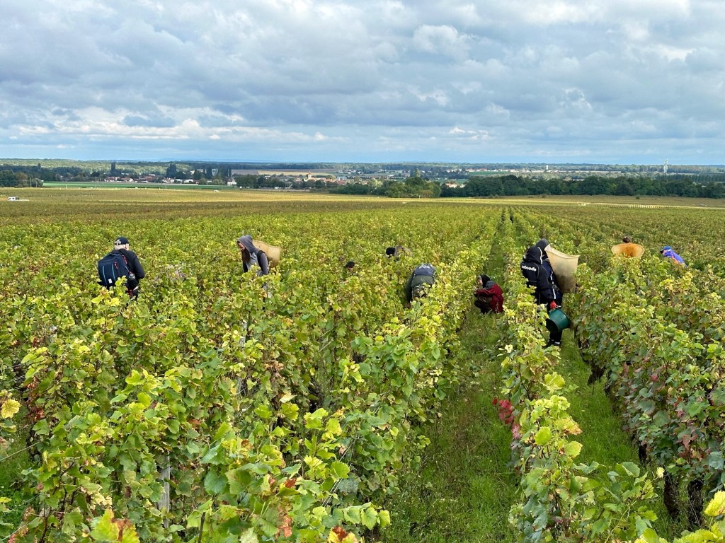 Entering Vosne, we see the first grape pickers of the trip, working in a distant field. After a 12-mile day, it’s at least a half-mile detour to get to them. I’m ambivalent, but Pat races off like a puppy who’s slipped his collar. I lag behind, and by the time I catch up, Pat is in the field taking photos. He yells to me, “They are all Hungarians!”