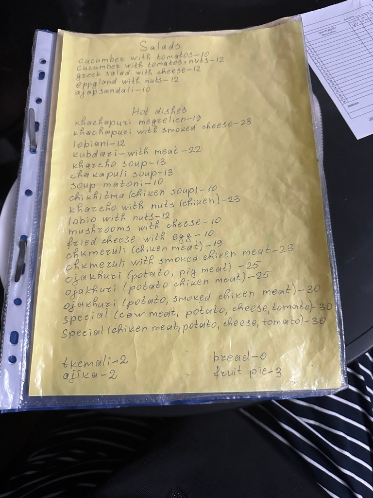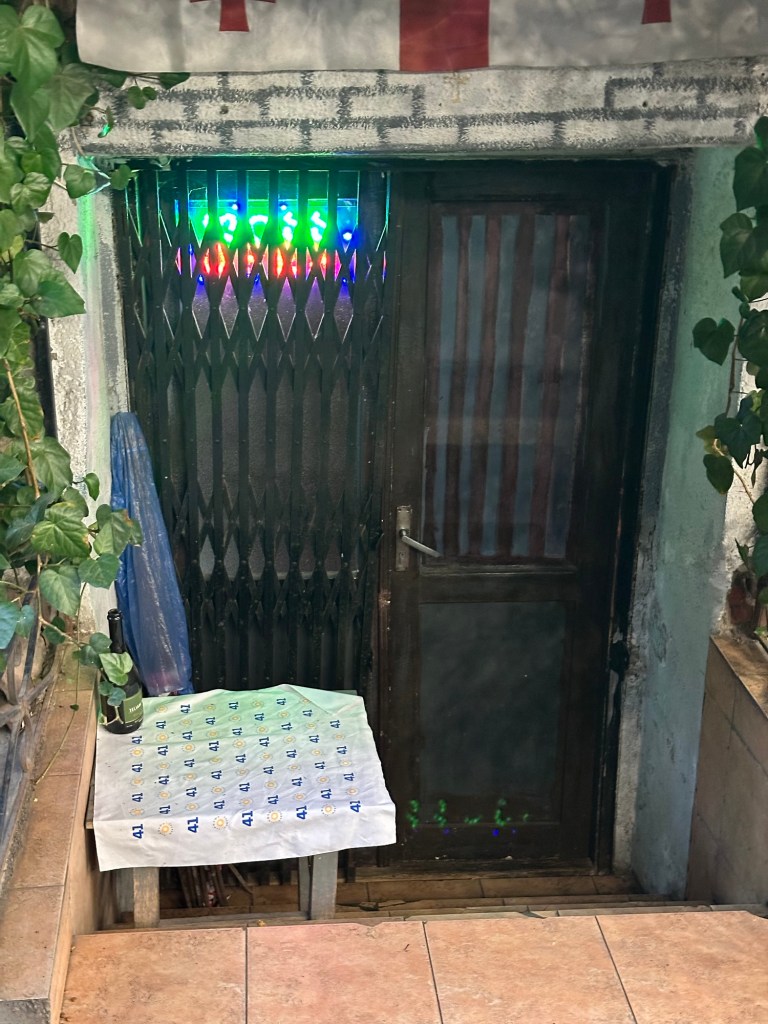 The first night, I arrived at my hotel shortly past seven in the evening and set off to find a place to eat. I hadn’t gone far before I noticed a blinking neon sign in a window below grade level. It was illegible to me with its curlicue Georgian characters. Unsure what to expect, I descended the stairs and opened the door to find a charming restaurant filled with, what appeared to be, happy Georgians.