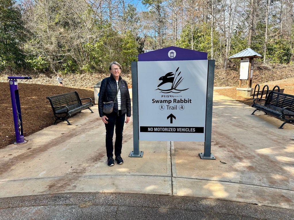 First, Greenville, South Carolina. To me this was a ho-hum choice and consequently received essentially no planning. Fortunately, a commenter on my last post told us to go to the Upcountry Museum and Biscuit Head (Thanks! We did!!—although we replaced Biscuit Head with Biscuit Barn). Our bookstore friend told us to visit his alma mater, Furman University (We did that too). Our urban planner son, Mike, had selected Greenville and told us to walk the Swamp Rabbit Trail. (Done)