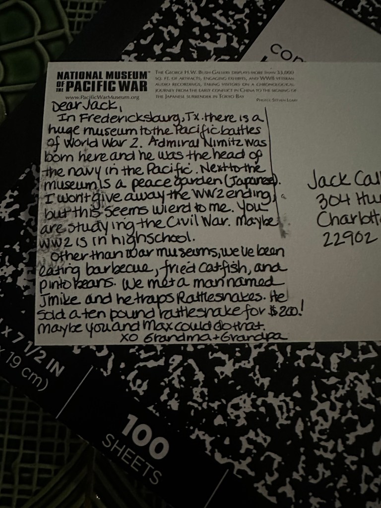 It was my quiet time. A chance to let him know that I was thinking about him. A time to remind myself how lucky we were that we got to keep him. I tried to include things about Jack. A bit about me. A sliver of our trip. If I know my daughter-in-law, these postcards still exist somewhere.