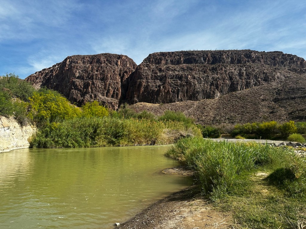 The following morning at the coffee shop, I take Pat through our next 24 hours: A stop at the Big Bend Panther Junction Visitors Center, a walk on the Windows Overlook Trail in Chisos Basin, a hike along the Rio Grande River into Santa Elena Canyon, dinner at the Starlight Theater in Terlingua with an overnight in Terlingua ghost town, finally onto Marfa for a few nights. A man nearby leans towards us and says, “Sorry to eavesdrop, but when you leave Terlingua, take the river route through Lajitas and then along the Rio Grande.”